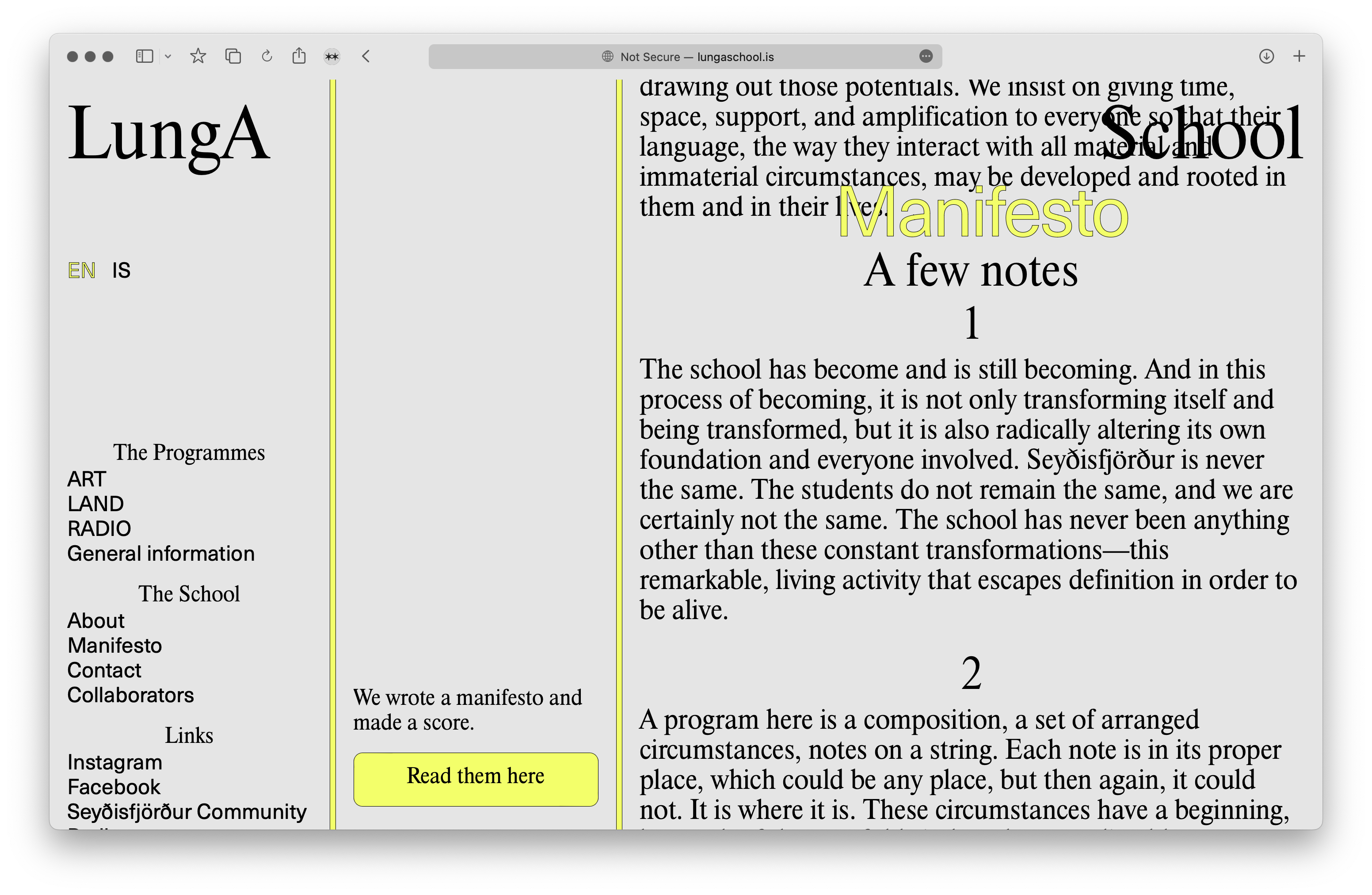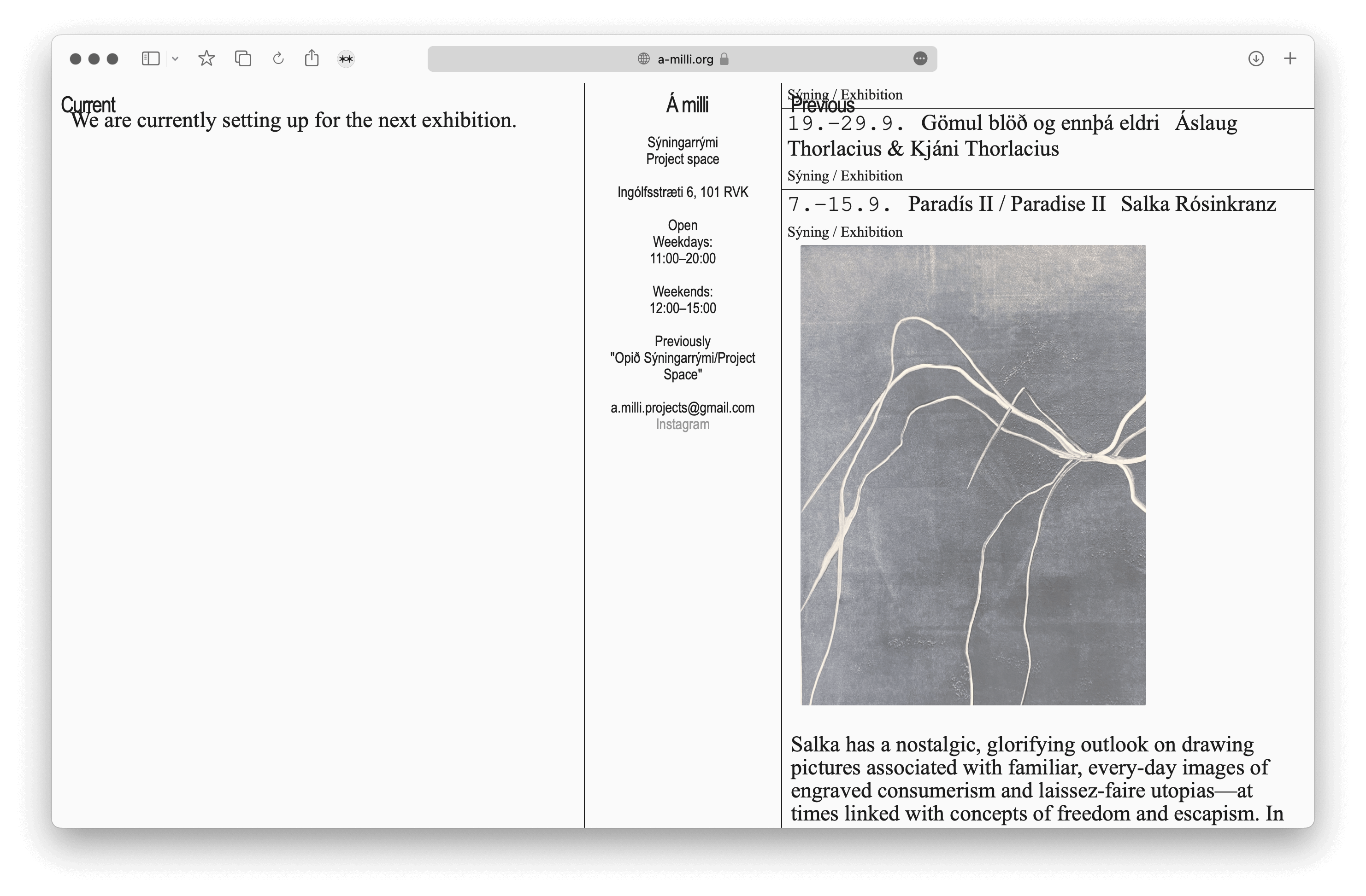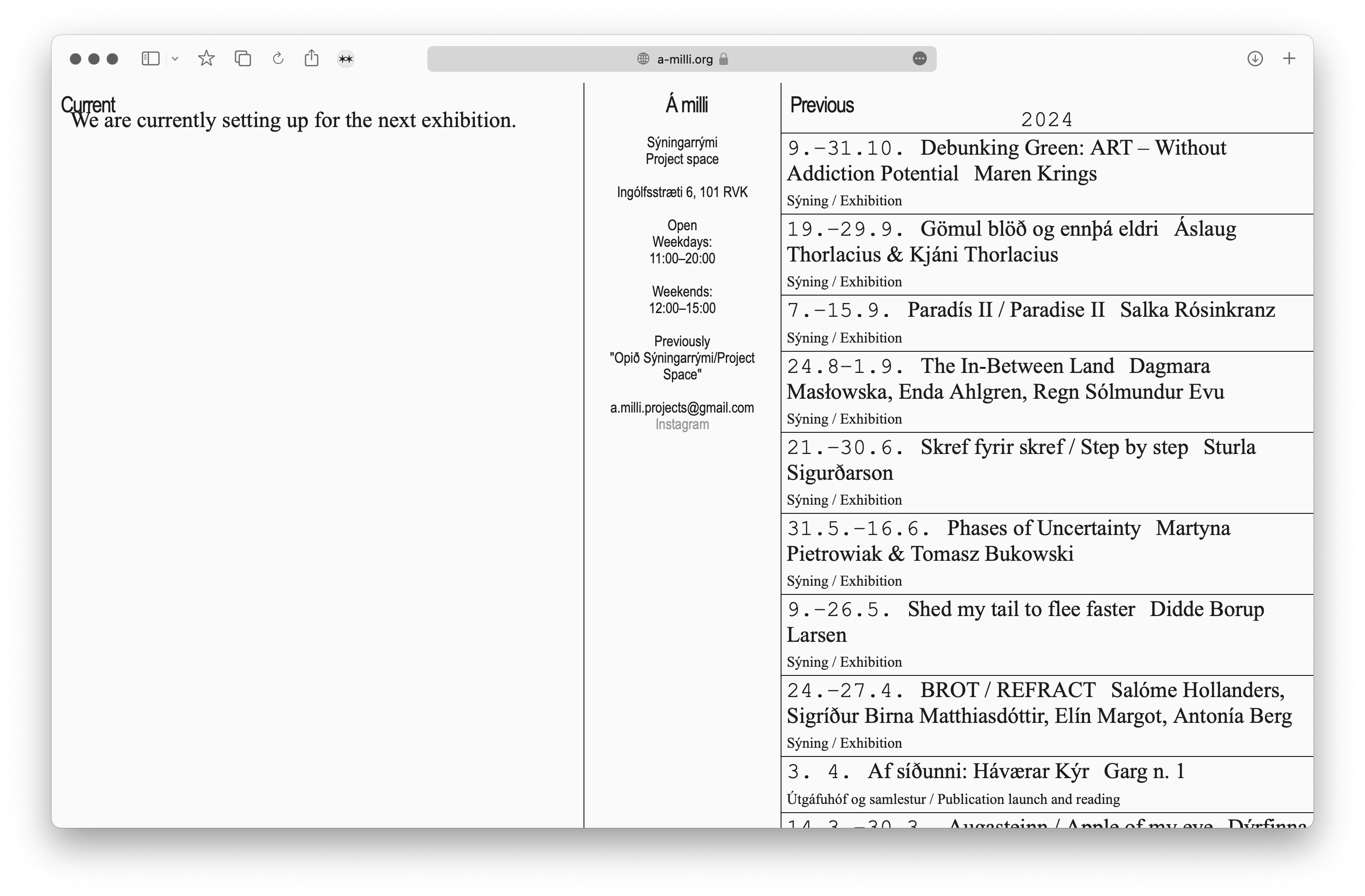 Graphic design and event organisation for artist-run project space Á milli in Reykjavík.